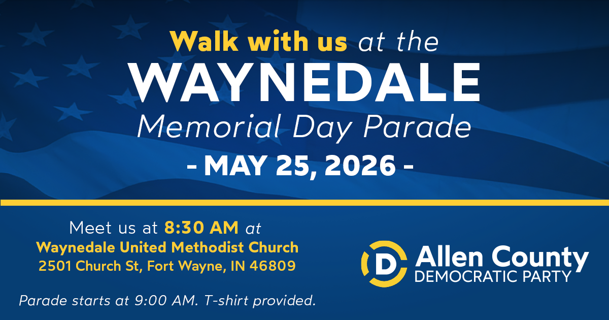 We need you for the Waynedale Parade on May 25th! The parade starts at 9 am and we need Democrats to represent in this parade. If you would like to walk with us, pay our respects on Memorial Day, and hand out some candy, sign up today!