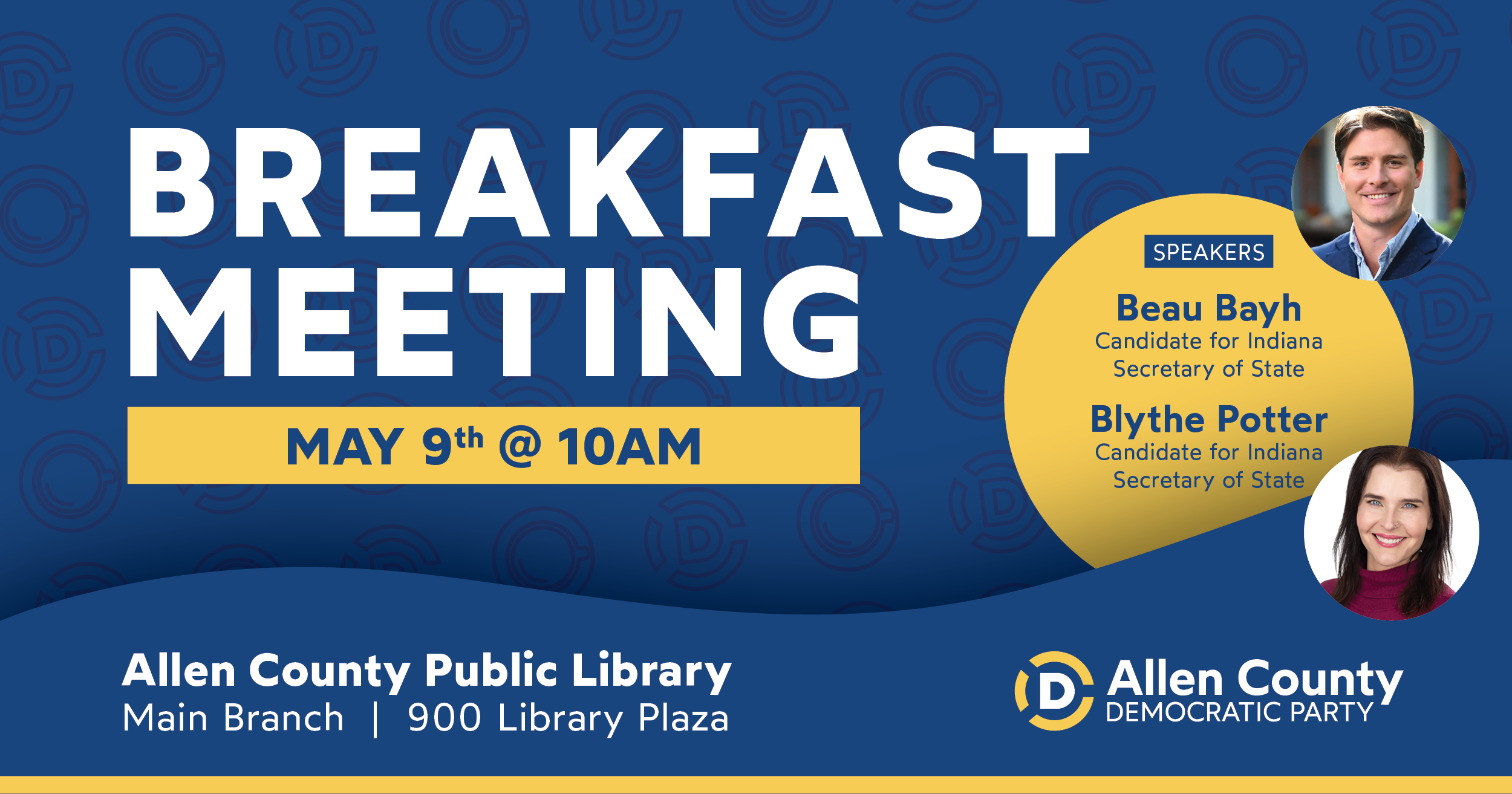 Join us on May 9th for our May Breakfast Meeting! The Primary is over, candidates have been chosen, and the Indiana Democratic Party State Convention is less than a month away. Hmmm, maybe that is why we are having Beau Bayh and Blythe Potter here to discuss the Secretary of State race?