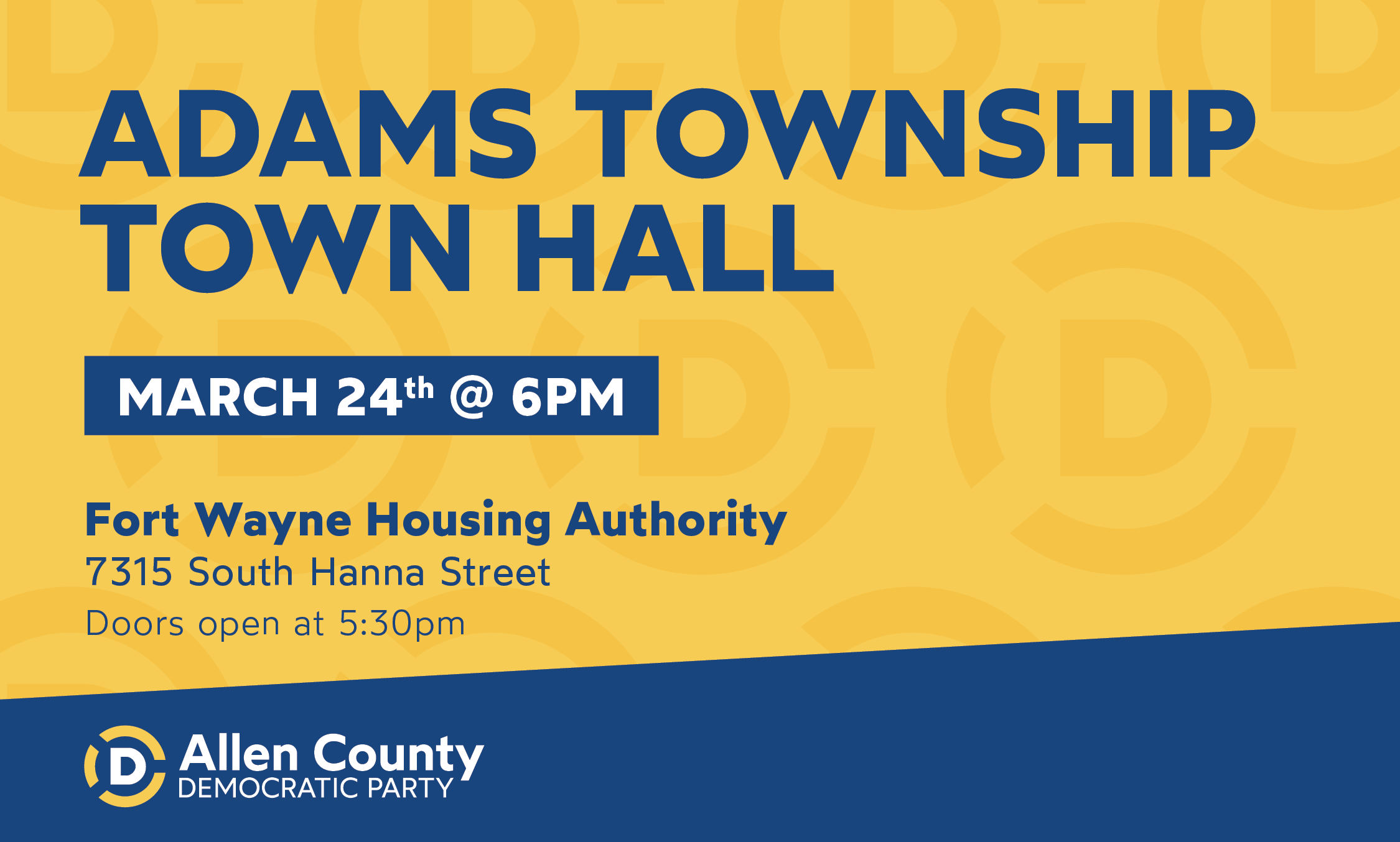 On March 24th, the Allen County Democratic Party will be hosting a Town Hall featuring the candidates running for Adams Township Board. Join us at the Fort Wayne Housing Authority for this amazing event. Doors open at 5:30pm and the Town Hall begins at 6 pm!