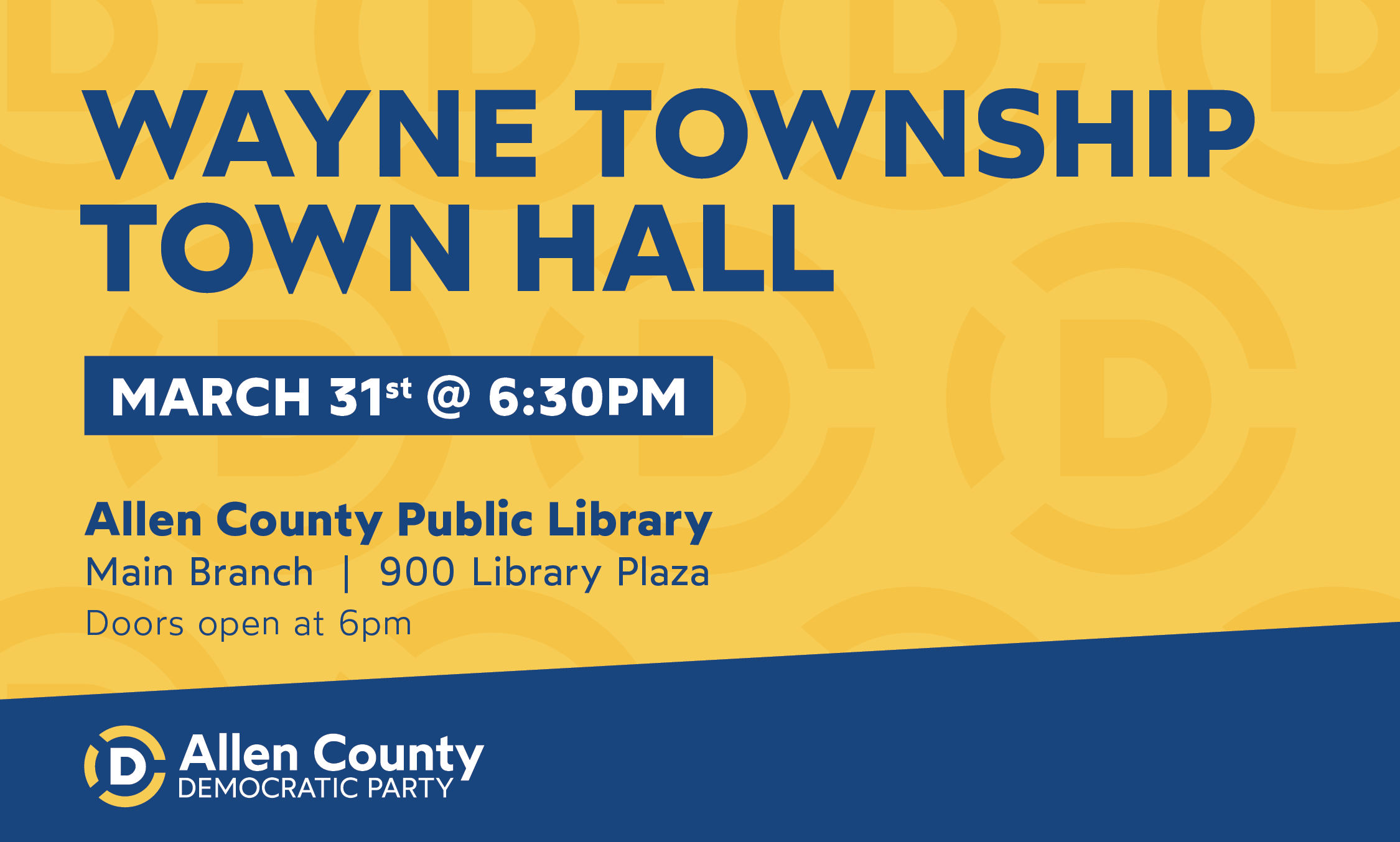 On March 31st, the Allen County Democratic Party will be hosting a Town Hall featuring the candidates running for Wayne Township Board. Join us at the Allen County Public Library Downtown Branch for this amazing event. Doors open at 6 pm and the Town Hall begins at 6:30 pm!